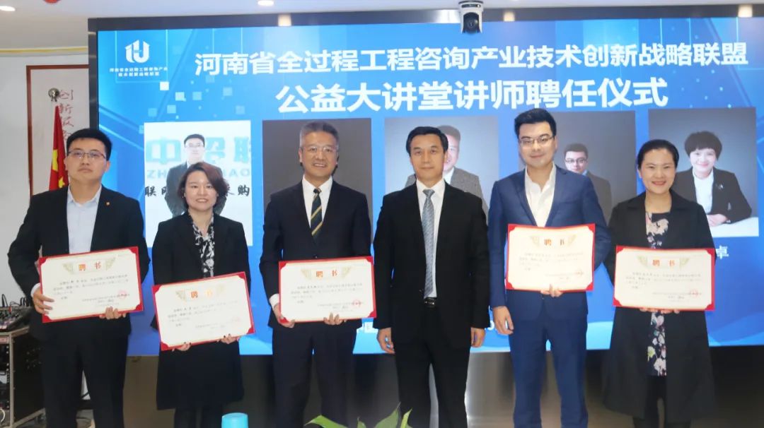 在與會(huì)人員的見證下,聯(lián)盟理事長(zhǎng)楊明宇為北京市百瑞(鄭州)律師事務(wù)所吳彥、袁武強(qiáng)、閆興偉、秦玉卓律師,中招聯(lián)合信息股份有限公司河南區(qū)域副總經(jīng)理鄭浩頒發(fā)全過程工程咨詢公益大講堂講師聘書。